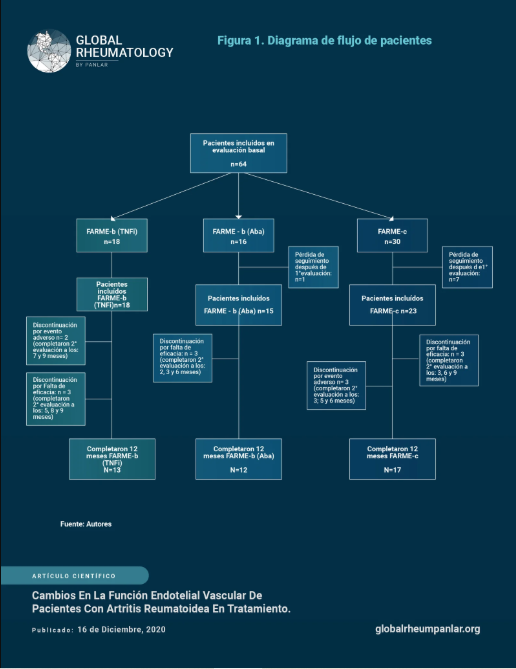Entre marzo de 2012 y febrero de 2014, se reclutaron 64 pacientes consecutivos vistos en la unidad de Reumatologia del Hospital Italiano de Buenos Aires, y el Instituto de Rehabilitación Psicofisica de Buenos Aires, Argentina, que cumplían los criterios de clasificación ACR de 1987 para AR (31-33) en quienes su reumatólogo tratante prescribió inicio o cambio de tratamiento con un nuevo FARME (incluyendo FARME biologico). Fueron clasificados en 3 grupos, pacientes que iniciarían tratamiento con FARME convencional (FARMEc), pacientes que iniciarían tratamiento con inhibidor del TNF [FARME-b (TNFi)], y aquellos que iniciarían tratamiento con abatacept [FARME-b (Aba)]. Al final del estudio, todos los pacientes permanecieron en el grupo en el cual iniciaron.