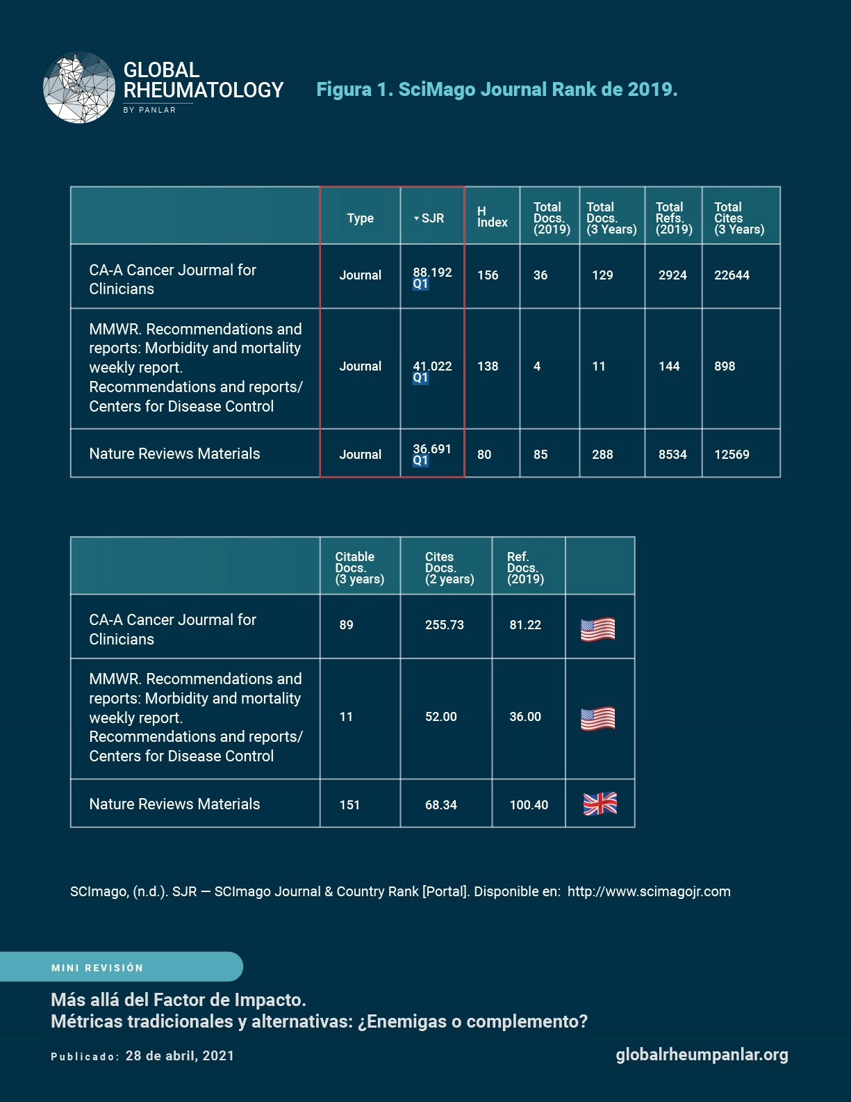 En los primeros lugares se encuentran revistas como New England Journal of Medicine (FI 74.6), Nature (FI 71.8) y Lancet (FI 60.3), en el campo de la reumatología por ejemplo Nature Reviews Rheumatology (FI 16.6), Annals of Rheumatic Diseases (FI 16.102), Arthritis & Rheumatology (FI 9.5), considerandolas las revistas más influyentes y prestigiosas en sus áreas de estudio (6). El número de revistas incluidas varía cada año, teniendo en cuenta que el ingreso y la permanencia en el listado dependerá del cumplimiento de los requisitos de selección (6).